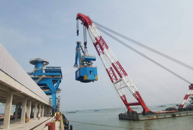 带斗门座起重机通过驳船运输到项目码头,由1台500吨浮吊完成吊装、并在码头组装成整机。本次卸船吊装工作历时2天完成。