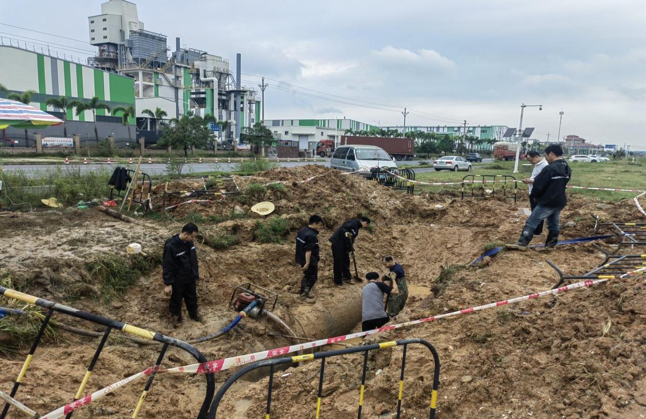 近日,位于北海市铁山港区兴港镇新二路(太阳纸业东门)处出现疑似管道漏水现象,污水公司立即组织人员前往现场开挖勘察查找原因,发现是尾水排海管排气阀脱落导致处理后的尾水大量涌出,为避免对周边环境造成污染,污水公司采取停机、关闭出水阀等应急措施,并制定修复方案。