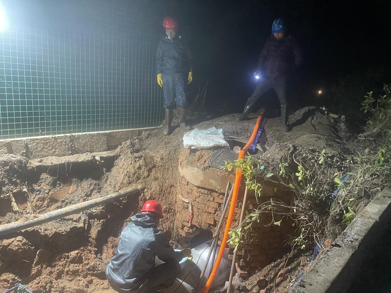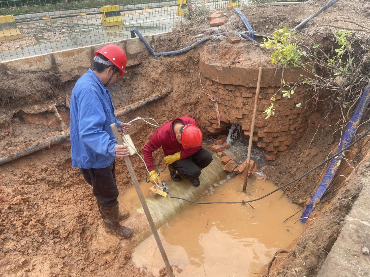 抢修人员对现场进行研判,立即组织人员开挖。经现场勘查,排海管漏水位置极为隐蔽,处于检查井壁下方,维修空间狭小,稍有不慎就有可能发生次生问题,给抢修工作带来了重重障碍。
