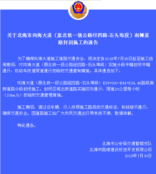 为了确保向海大道施工道路交通安全,现决定自2019年7月25日起至施工结束期间,对向海大道(原北铁一级公路经四路-石头埠段)实施分段半幅封闭半幅通行,机动车改道限速通行的临时交通管制措施。具体通告如下: