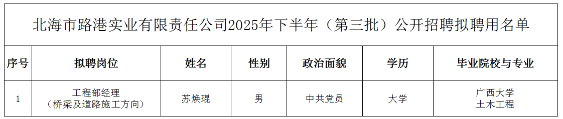 附件:北海市beat365管道管网有限公司2025年下半年(第三批)公开招聘拟聘用名单
