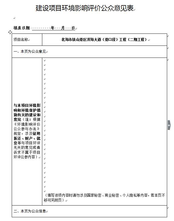 若您对项目有什么意见和看法,请于公示之日起十个工作日内,反馈建设单位或环境影响评价单位。可填写公众意见表发送电子邮件或通过邮寄信函(以邮戳日期为准)的方式反映与建设项目环境影响有关的意见和建议。您在提交意见时,请注明提交日期、真实姓名和有效的联系方式,以便根据需要反馈,并且您的个人信息未经允许不会对外公开(法律法规另有规定的除外)。
