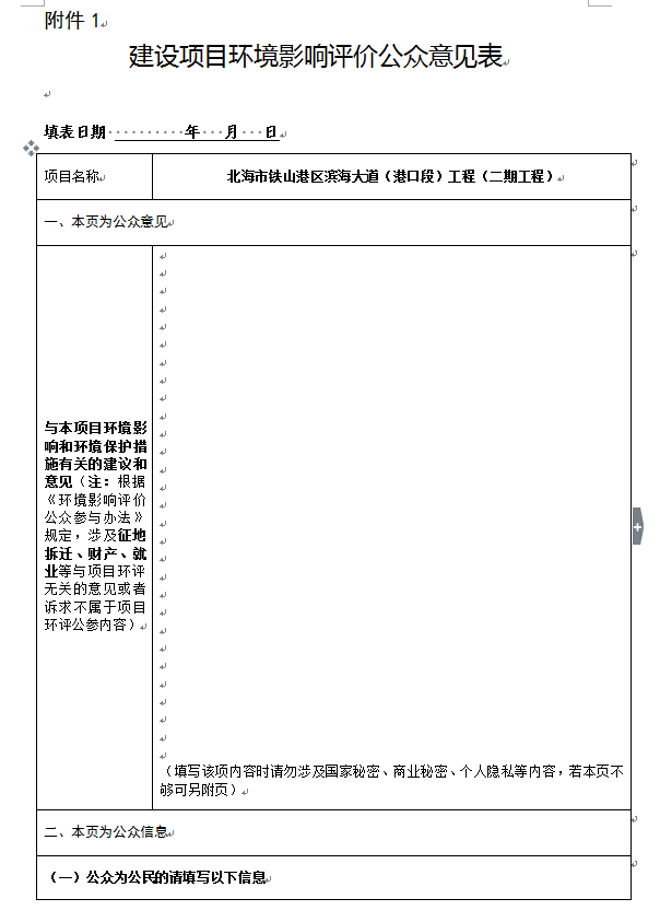 《北海市铁山港区滨海大道(港口段)工程(二期工程)项目环境影响报告书》(征求意见稿)公示